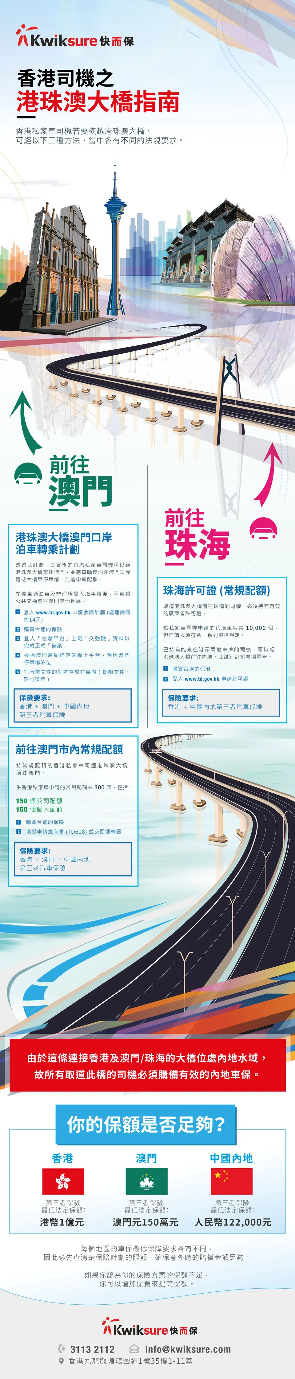 However, this cross-border route is mainly operated by private shuttle buses. Private car drivers in Hong Kong, regardless of their destinations, will have to go through some rather intricate formalities if they have to use the bridge. To that end, our experts at Kwiksure have curated this downloadable and printable infographic to illustrate how to cross the bridge in a more easy-to-digest and concise manner.